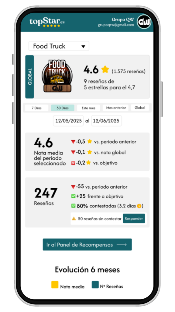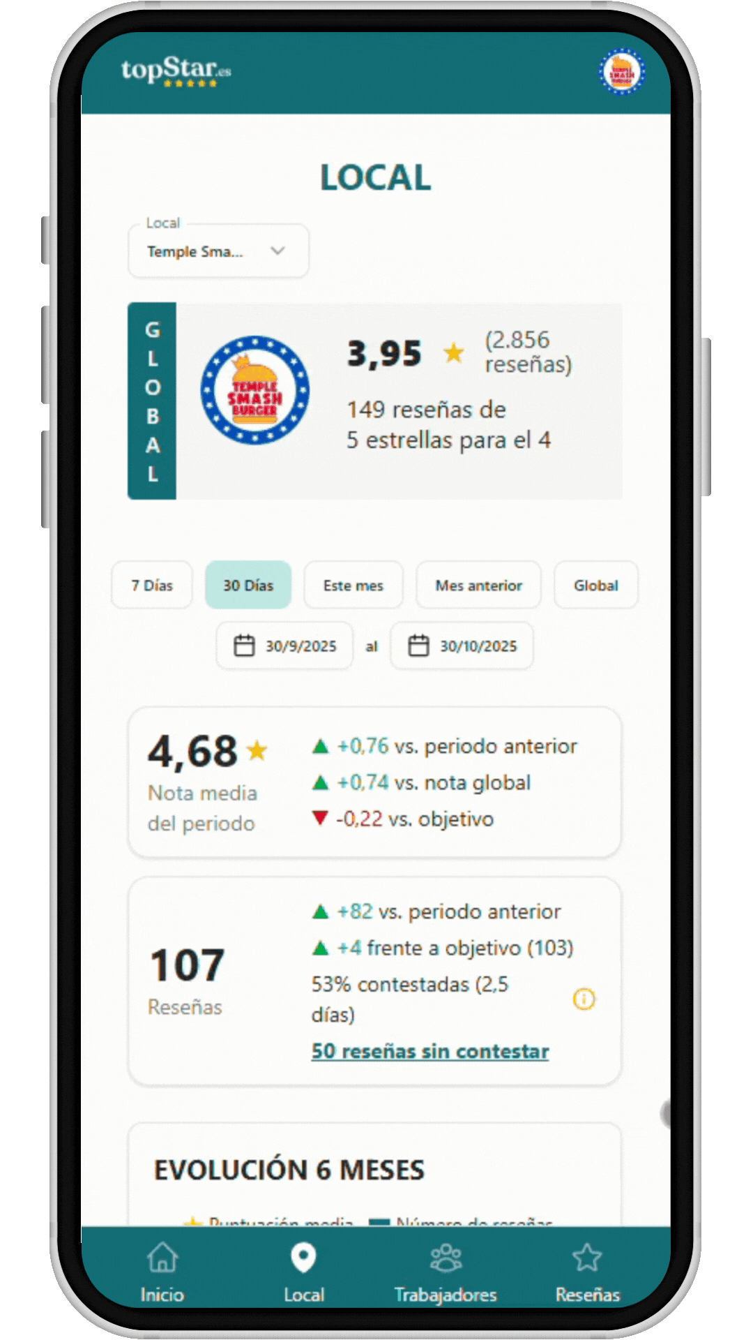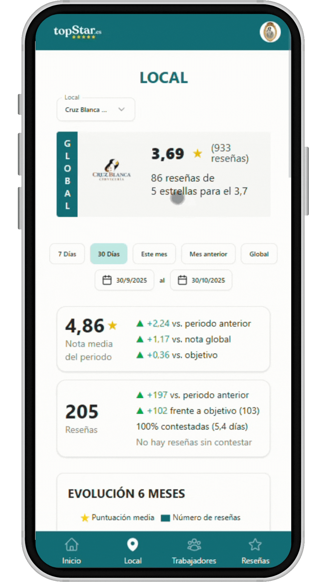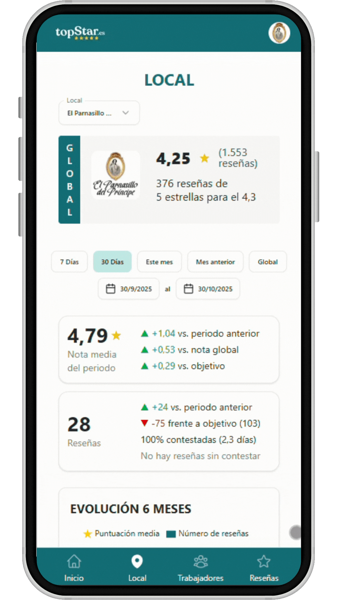 Obtén estadísticas por local o por empleado, generar informes y medir el impacto real de tu reputación digital.